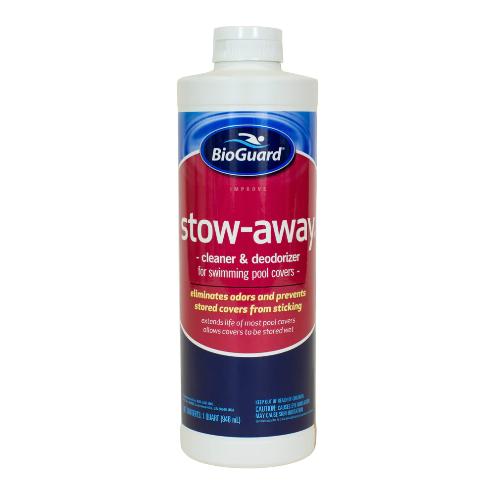 BioGuard StowAway cleans and deodorizes pool covers to prepare them for storage. Even when pool covers are stored wet, this product cleans, deodorizes, and prevents the cover from sticking together when it is folded. StowAway aids in stain and soil removal and extends the life of most covers. It is a versatile product that may be used on solar covers, pool umbrellas, and other pool-side items. Prepare your pool cover for storage the right way with StowAway.
