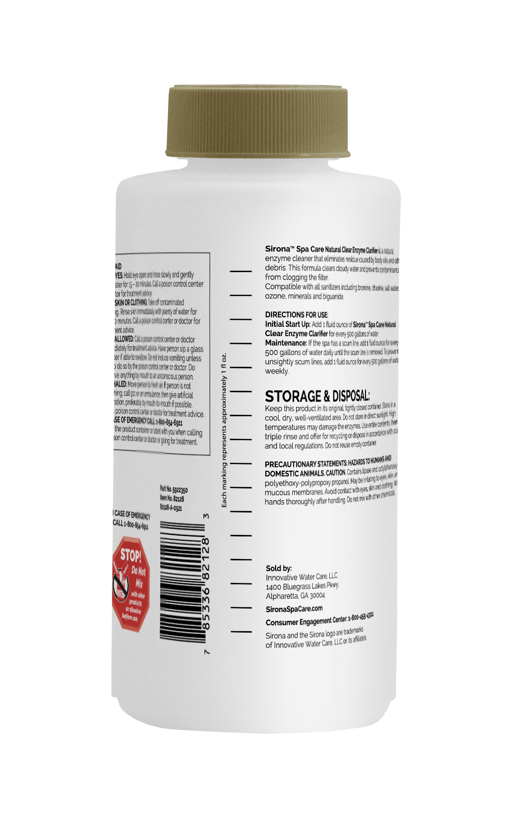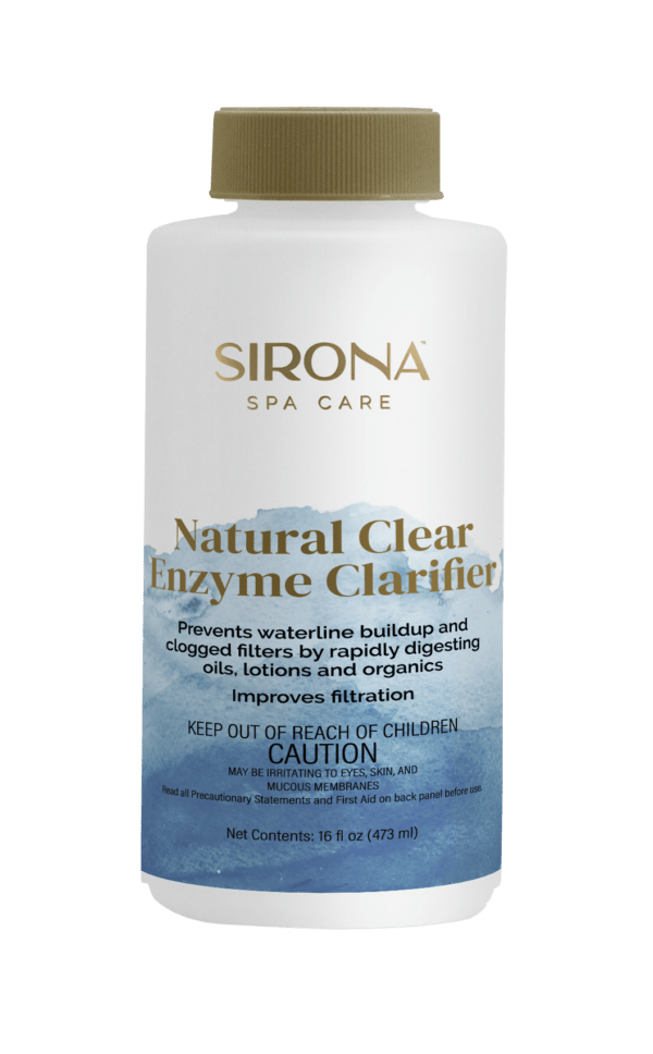 The Sirona Spa Care Natural Clear Enzyme Clarifier is a liquid formula that is designed to eliminate residues left behind by body oils, lotions, organics and other debris. Clear up unpleasant cloudy water fast, and prevent those contaminants from clogging the filter. Remove and prevent unsightly waterline buildup, while also improving the quality of filtration. This Enzyme Clarifier is compatible with all sanitizers including bromine, chlorine, salt water, ozone, minerals and biguanide.