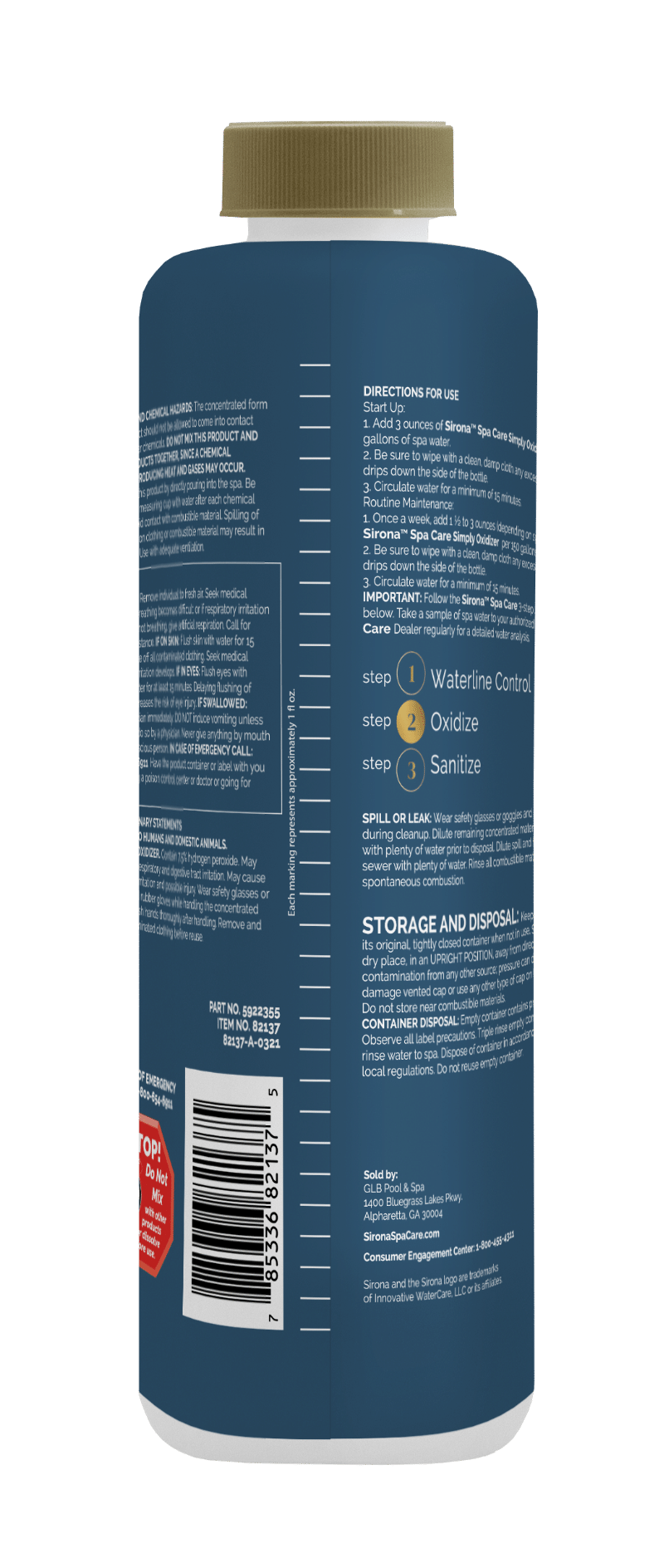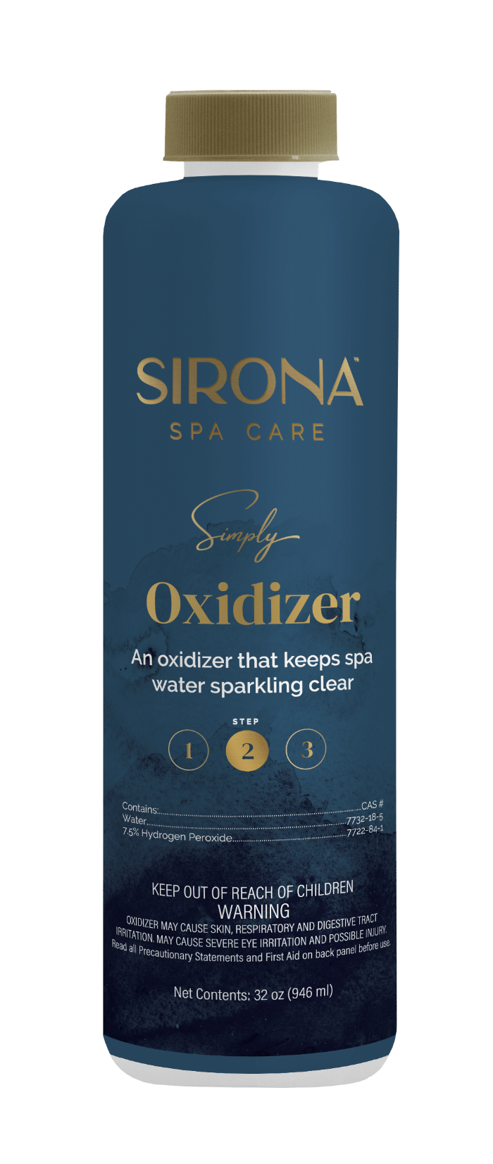 The Sirona Spa Care Simply Oxidizer is the second step in the Sirona Spa Care Simply 3-Step System. This oxidizer is a hydrogen peroxide based product that will efficiently keep spa water sparkling clear. Use this oxidizer product to help keep your spa clean and clear.